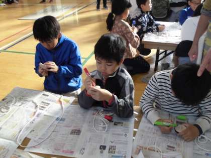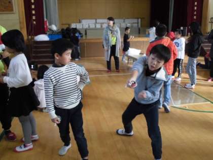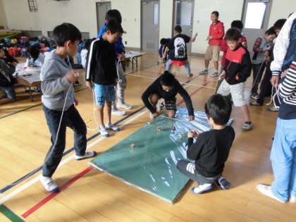 自分のこまが出来上がったら,みんなでこま回しをしました。いろいろな技を教え合ったり,こまの回し方を友だちに伝授したりして楽しい時間を過ごしました。