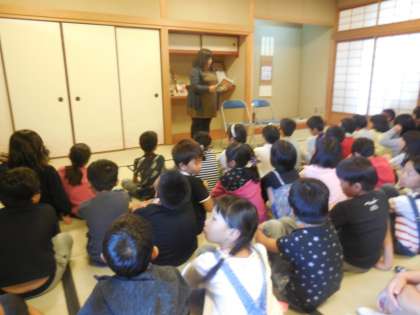 図書ボランティアさんにアーノルド・ローベルさんの本を読んでもらいました。大好きなかえるくんとがまくんのお話や可愛いねずみのお話でした。