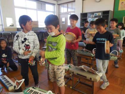 音楽室で様々な楽器の音を楽しんでいます。リズムに合わせることは難しいので挑戦中の子どもたちです。
