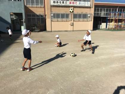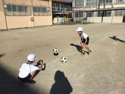 はじめに1人1つのボールをつかって,投げてキャッチをしました。そのあと,2人組で2つのボールをつかってパスをしたりしました。