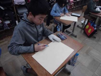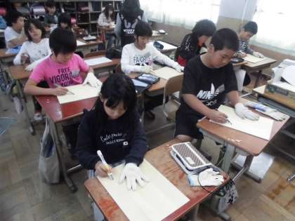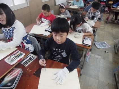 初めての彫刻刀だったので,まずは練習で直線や曲線をほりました。「緊張する!」と言いながらも,集中して作業を進めることができました。
