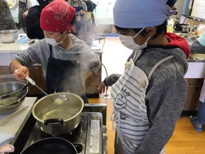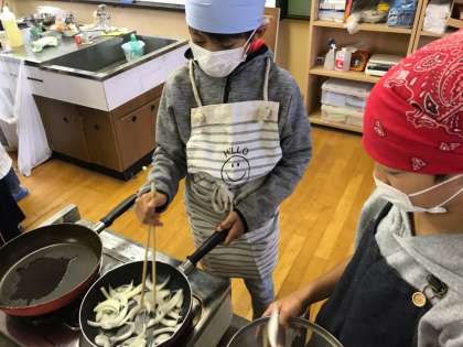 6年生は,交流学級の児童と一緒に調理実習を行いました。たまねぎを上手に炒めました。