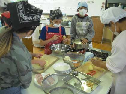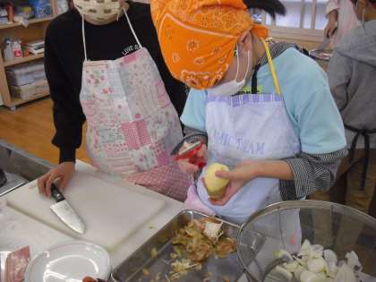 協力して調理しています。