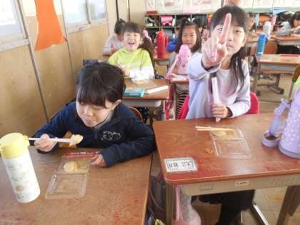 5年生が大事に育てたお米でおもちをついたのをいただきました。