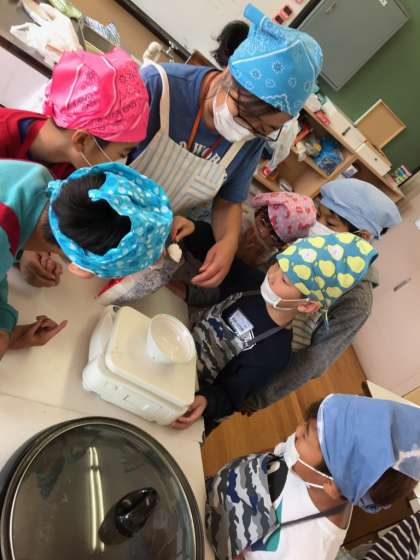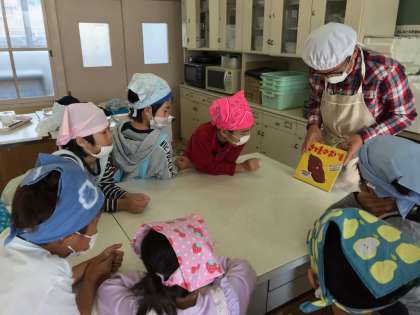 砂糖の量を測りました。鍋でぐつぐつ似ている間に,さつまいもの本を読んでもらいました。