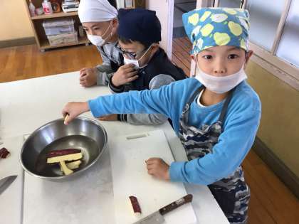 4くみの2年生は,二日続いてのおいも調理です。4くみの子も,「はじめます」とセリフを上手に言えました。