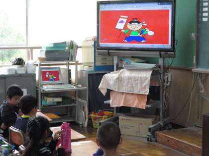 お弁当を食べた後は,大型テレビに映っている桃太郎のお話を聞きました。