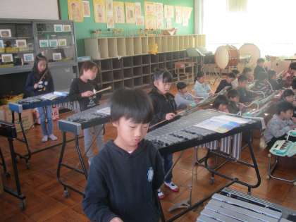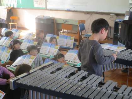 班で星空の様子を楽器で表す音楽づくりをしました。夕方から少しずつ星が増えてくる様子,夜空にたくさんの星が光っている様子,朝になりだんだん星が少なくなっている様子を,班で相談して音に表していました。