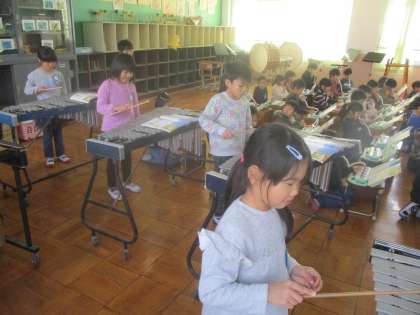 音楽室へ行き,「きらきらぼし」を鍵盤ハーモニカと鉄琴で合わせて演奏しました。「鉄琴の音がきれい!」と喜んでいました。