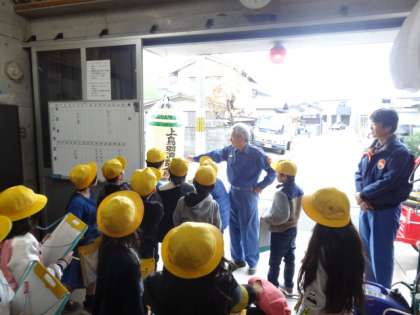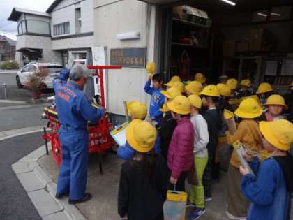 今年度から,これまで4年が学習していた「安全なくらしをまもる」の学習を3年で行います。先日は,上鳥羽消防分団の方に来ていただいてお話を聞きました。