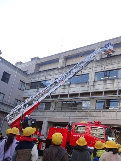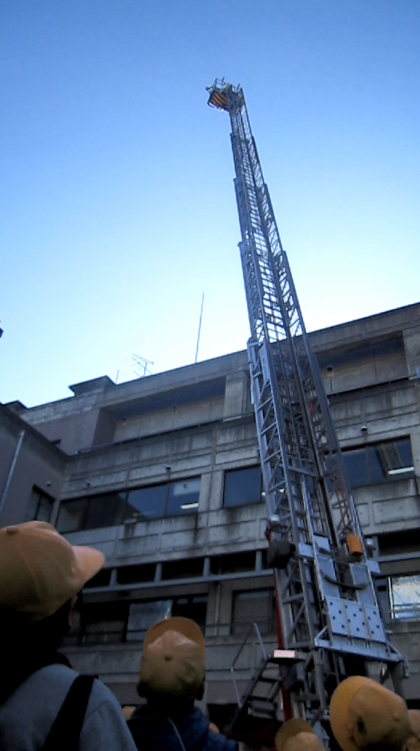 南消防署で見せていただいたはしご車の長さに子どもたちは驚いています。