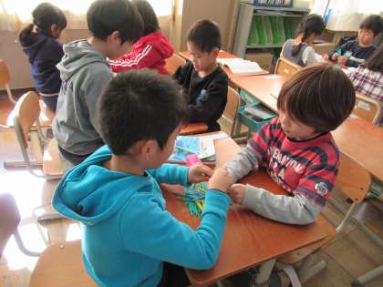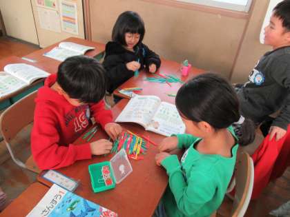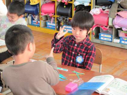 「大きなかず」では,20よりも大きな数について学習しています。数え棒などを使って,ペアで活動しながら,大きな数を学んでいます。