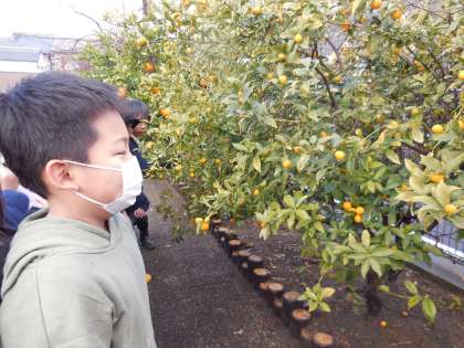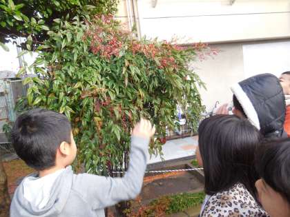 お出かけをしたのは,学校の正門前!実は上鳥羽小学校は冬の植物でいっぱいなんです。南天や金柑!