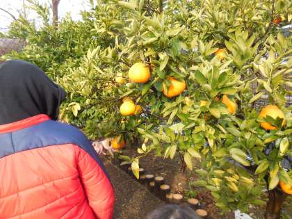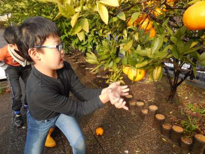 「いよかんが割れているよ。」「鳥とかが食べに来たのでは?。」想像が膨らみます。寒い冬ですが学校前は色とりどりの色でいっぱい。ツバキやサザンカも大変きれいに咲いていました。