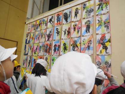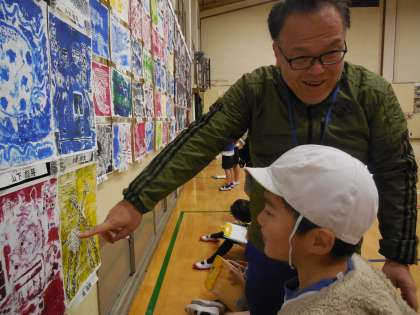 先生にもすてきな作品のことたくさん報告してくれます。「先生,この版画すごいで。」「先生,目が合うで。この作品!」と可愛い2年生。