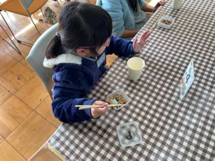 お箸をつかって豆つかみを頑張りました。