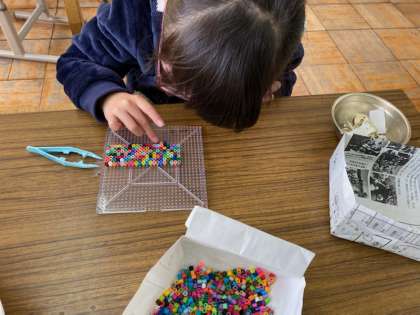 色にこだわらないで,もくもくと並べて楽しむ子もいます。それぞれの楽しみ方で,指を使いながら遊んでいます。