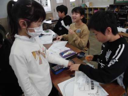 「What do you want?」という言葉を使い,友達と食べ物カードをやりとりしてオリジナルピザをつくりました!子どもたちは楽しそうに活動していました。