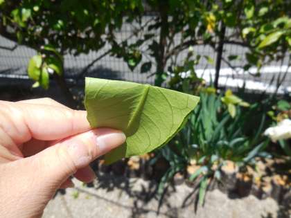 また,レモンの葉を2つにおって,においをかいでみるとレモンのとてもいいかおりがしました。