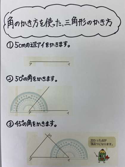 12ページの算数プリントでは,角のかき方を使って三角形をかきます!