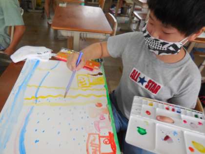 図画工作科「絵の具+水+ふで=いいかんじ」では,絵の具ですてきな色を作って線や形と一緒に表現しました。面白い線や形に出会ったり,同じ形を重ねる楽しさに気付いたりして作品を仕上げていました。