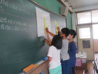算数の学習では,線対称な図形をかきました。どのようにかくことができるか,みんなで相談しながら学習しました。