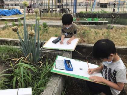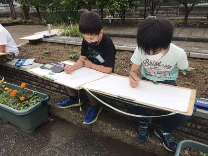 休校だった影響で6月になってしまい,お花があまりなかったのですが,ねぎぼうずやサルビア,マリーゴールドなど,一人一人描きたい花を選んで,スケッチしました。