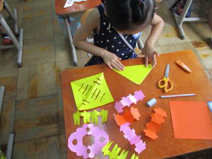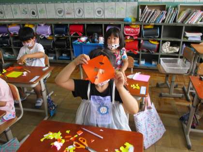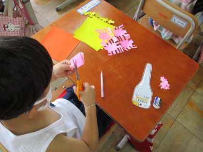 折り紙を折って,鉛筆で印をつけて,はさみできりました。開くとどんなもようになるのかな。