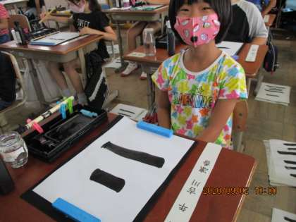 筆使いは鉛筆と違ってとても難しいです。力の入れ具合を先生から聞いて書いてみると,「おお!」「上手に書けた!」と嬉しそうな子どもたちです。
