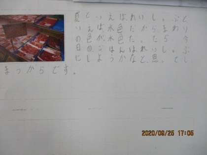 スーパーマーケットでこんなにたくさんお客様のために工夫をしているなんて驚きです。自分の思いも伝わるように頑張って書いています。見やすいように写真を貼る位置やイラストも入れて,工夫しています。気分は新聞記者です。