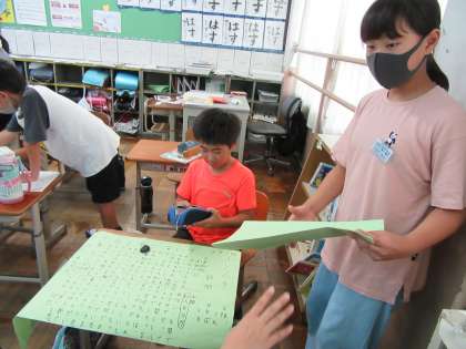 完成した後には,3年生に発表をし,「そんな上鳥羽小学校のひみつ知らなかった!」と喜んでくれる3年生の反応をみて,がんばって作った成果が感じられた様子でした。