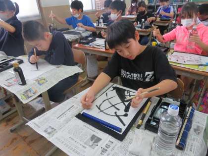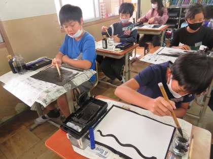 図工の学習では,墨を使ってえをかきました。歴史学習で学んだ水墨画に近づけたでしょうか。思い思いにえがきました。