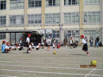 体育で練習したドリブルとパスでボールをつなぐリレーをしました。