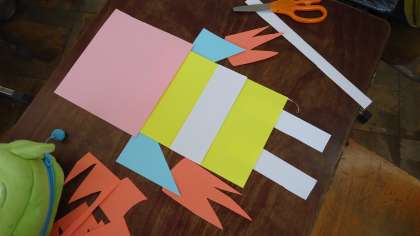 「こんなものがあったら」という単元で,「ロボット」を共通のテーマに絵をかいていきます。「どんなロボットがあればいい?」と聞くと,「宇宙までいけるロボット。」「かき氷をつくってくれるペンギンロボット。」「動きが早いバイク型のロボット。」「町を遊園地にしてくれるロボット。」など子どもらしい発想がどんどんあふれました。そのイメージを基に,色々な色画用紙を組み合わせてロボットのかたちを作りました。来週は,まわりの絵をかいていきます。
