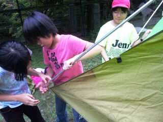 テントを手際よく立てたあと,時間が余ったため,川に涼みにきています。さっそく草船をうかべてみたり,カエルをつかまえたり,自然を満喫しています。