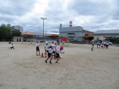 体育では,リレーをしています。バトンパスをうまくして,タイムを伸ばせるよう,チームで作戦を立てていきます。