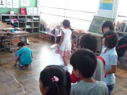 算数科で「時間と長さ」という単元の学習をしています。まきじゃくを使って,さまざまなものを測りました。教室の縦・横,黒板,ろうかなど身近なものの長さを測ってみました。教室の縦の長さと横の長さがほぼ同じだということに気がつきました。(今まで知りませんでした。)また,100mを実際に歩いて,何秒かかるのかも体験してみました。教室を飛び出して,実際に体験すると,子どもたちの顔がきらきらするなと改めて感じました。
