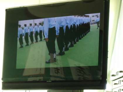 今日来てくださったのは、上鳥羽分団の分団長、狩野さんです。京都市消防団総合査閲で優勝された時のDVDを見せてもらい、普段の消防団の活動についてお話を聞かせてもらいました。