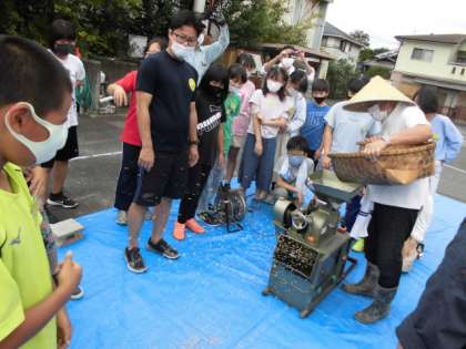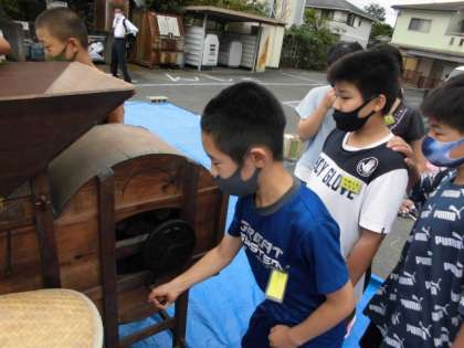 先週,刈った稲を脱穀しました。足ふみ脱穀機にかけ,穂を取ります。とった穂を唐箕にかけ,穂を選別します。最後に,もみすり機にかけて,玄米の完成です。今年は豊作で約9Kgもとれました。子どもたちは,普段食べているお米が,こんな風にできているなんて驚きだったようです。たくさんの方の協力を頂き,貴重な体験ができました。