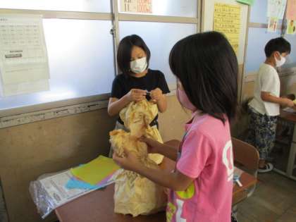 図画工作科「くしゃくしゃぎゅ!」の学習では大きなクラフト袋をくしゃくしゃにしてそこから想像をして生き物を作りました。大きな袋を小さくしたり,耳やしっぽを作ったり,ぎゅっと握ってみることで,自分の思い通りの形にしていきます。
