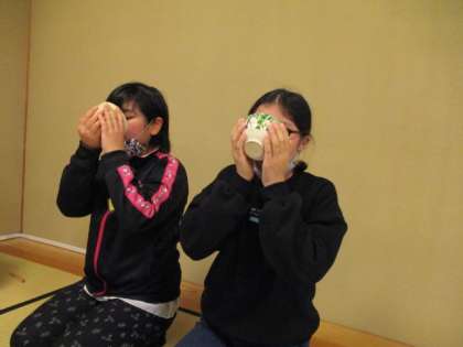 「おいしかった。」「にがかった。」「ちょっと全部飲めません。」「思ったより,おいしい。」「お茶漬けのにおいがします。」感想はさまざま。茶菓子をいただき,自分で点てたお茶を飲んだ子どもたち。どの子もいい顔をしていました。