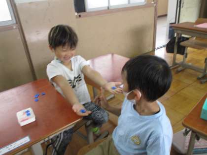算数「いくつといくつ」の学習では,手の中におはじきをかくして数あてゲームをしました。8このおはじきを分けて手の中にかくしました。「いくつかな。」「こっちが4だから,もう一つも4かな。」当たるととても嬉しいです。ゲームを通して数の大きさを学習する1年生です。