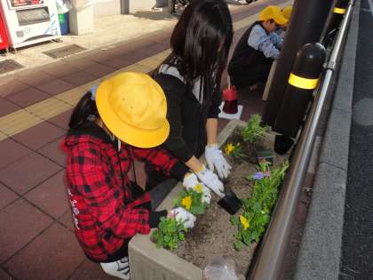 5校時に5年生・6年生で、国道1号線久世橋通り付近のプランターにチューリップの球根やパンジーの花を植えました。