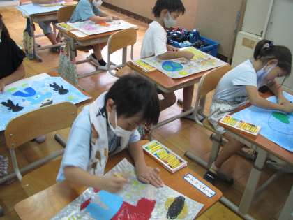 絵本の読み聞かせを聞いて、場面を想像して絵をかきました。