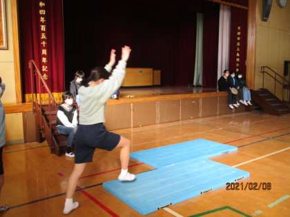 体育の学習では、マット運動に取り組んでいます。いろいろな技が美しくできるためには体をどのように動かしたらよいか、友だちと協力して楽しみながら学習しています。