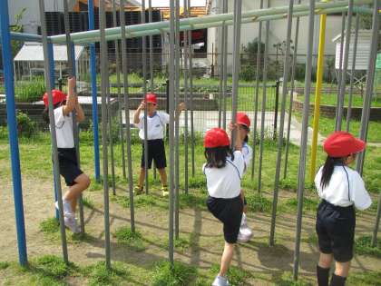 運動場では、ルールを守って遊具で遊んだり、リレーをしたりして楽しみました。