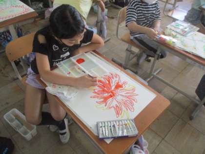 図画工作科『まぼろしの花』の学習では,線描きした花の絵に,絵具をのせていきました。