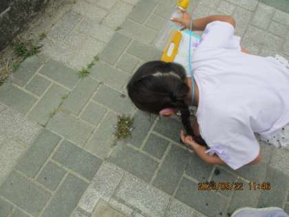 たんぽぽのちえの学習では、他の草花のちえも知りました。学校の色々な草花に興味を示す2年生。「先生、これは、なんていう花?。土がないのにさいているのかしこいね。」と草花が自分たちの仲間を増やすために頑張っている姿を上手にみつけていました。