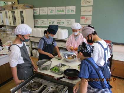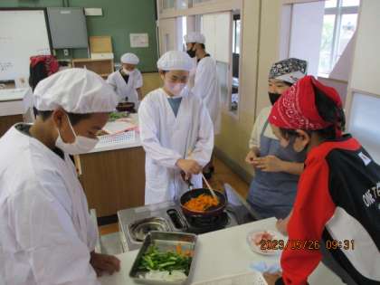5月25日、26日と調理実習をしました。グループで協力しながら、火加減・味付けともに上手にいろどり野菜炒めを作ることができました。