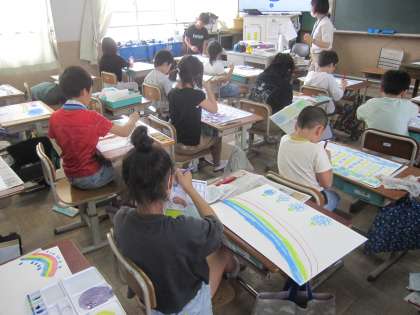 6月だと感じるものを想像しながら、色を混ぜたり、水の量を調整して、自分だけの色を作りました。その色を使って、「6月」を表現することができました。